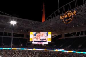 镜头给到看台上巴西足球传奇球星罗纳尔多,大罗非常开心。