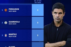 阿尔特塔连续两赛季带队进入欧冠四强,成英超历史第五位主教练