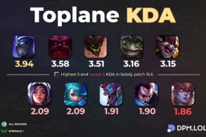 体育资讯3月29日讯 全球统计单排KDA最高和最低的5位上单英雄:慎最高、新版龙女最低。